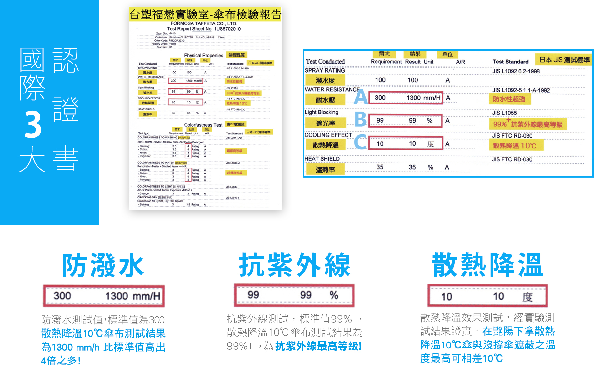 對UV-A.UV-B的UV-CUT可達99.9%以上強化對肌膚的保護,防潑水測試值高達1300!比正常值高出4倍以上!
