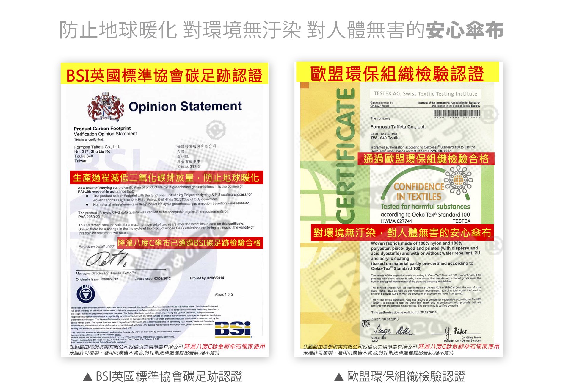● 此驗證證明該傘布產品無毒,符合歐洲 OEKO-TEX® Standard 100 的環保與人體安全標準。