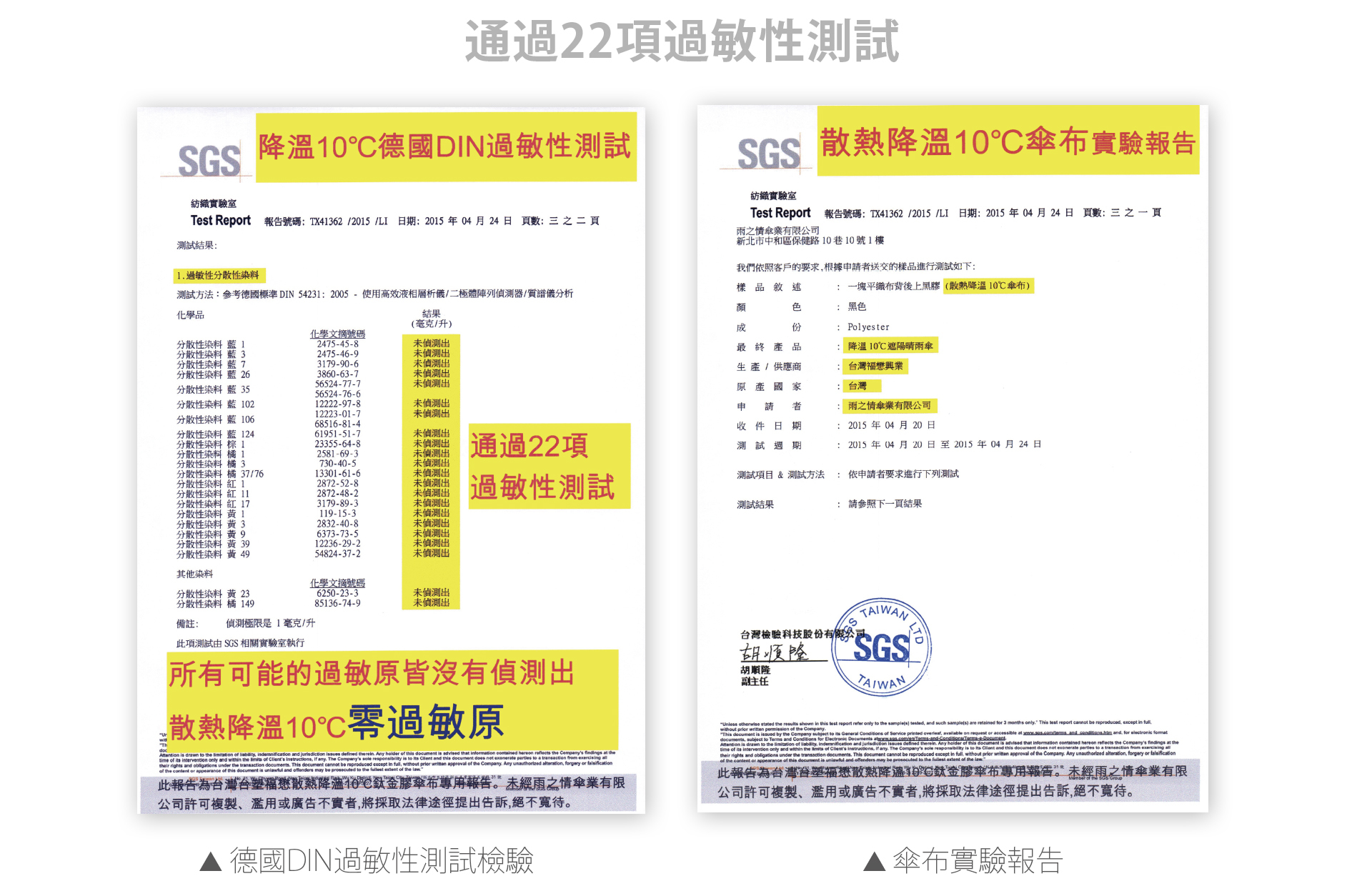 ▲ 傘布實驗報告由 SGS 認證測試