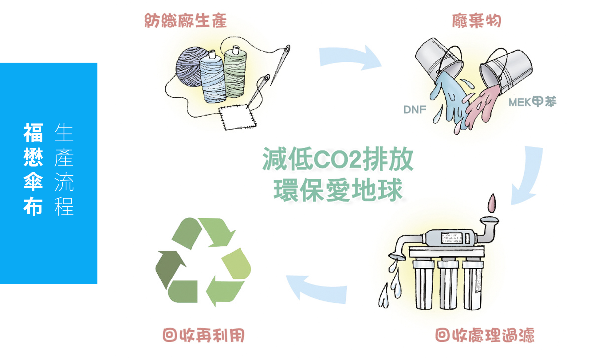 透過這一連串環保設計流程,福懋傘布實現資源循環、降低碳排放,兼顧品質與地球永續。