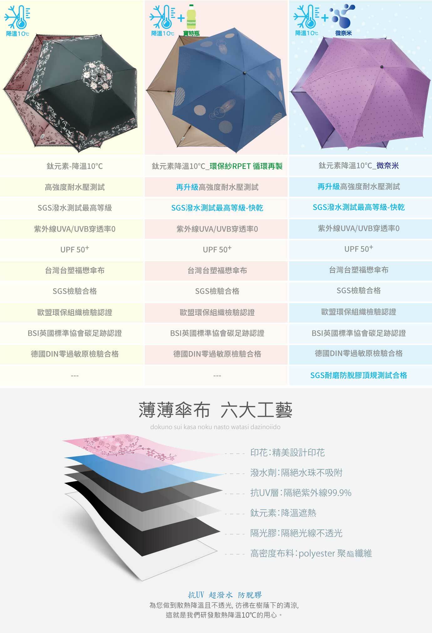 奈米鈦元素使傘布具備散熱降溫最高10℃的特性!並且通過日本カケン檢測中心、歐盟環保、英國碳足跡認證。