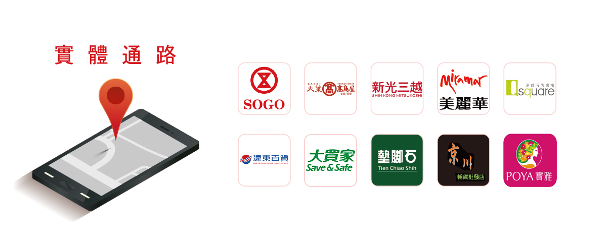 SOGO、大葉高島屋、新光三越、美麗華、京站時尚廣場、遠東百貨、墊腳石、京川暢貨批發、寶雅生活館(全台)