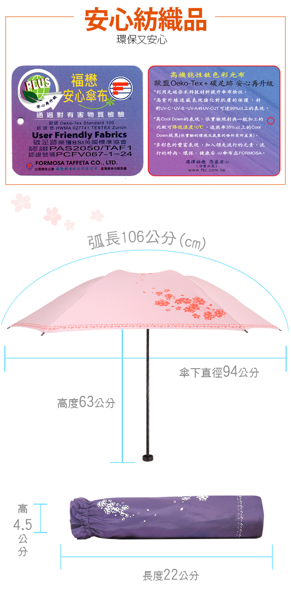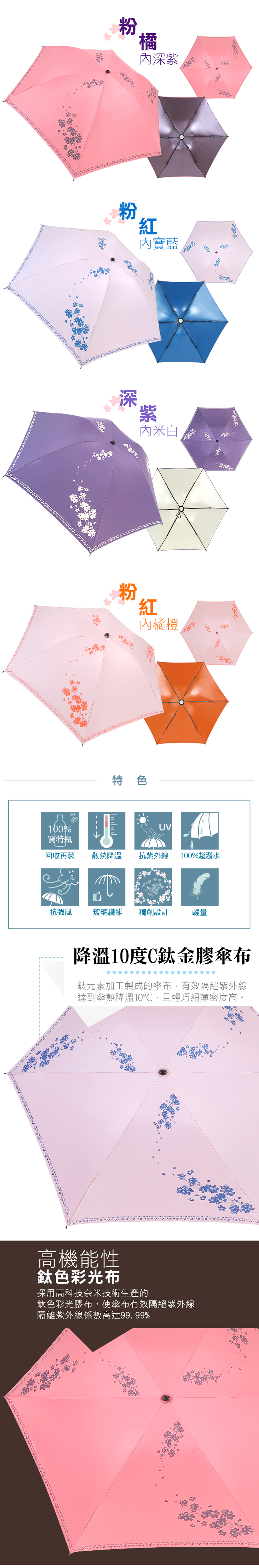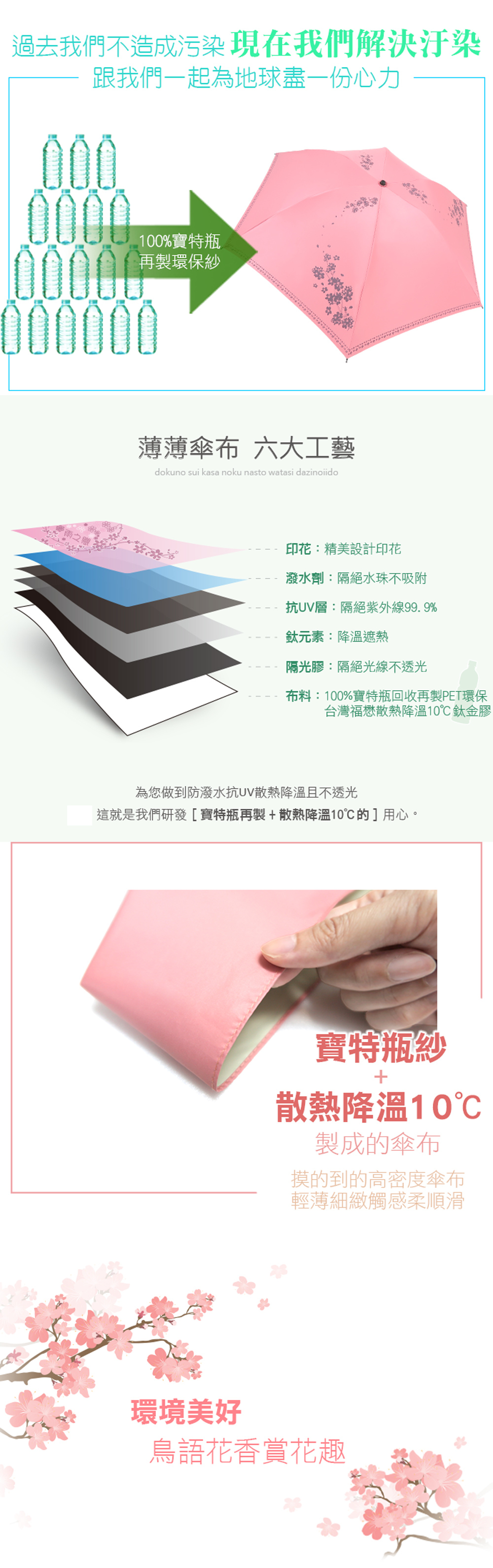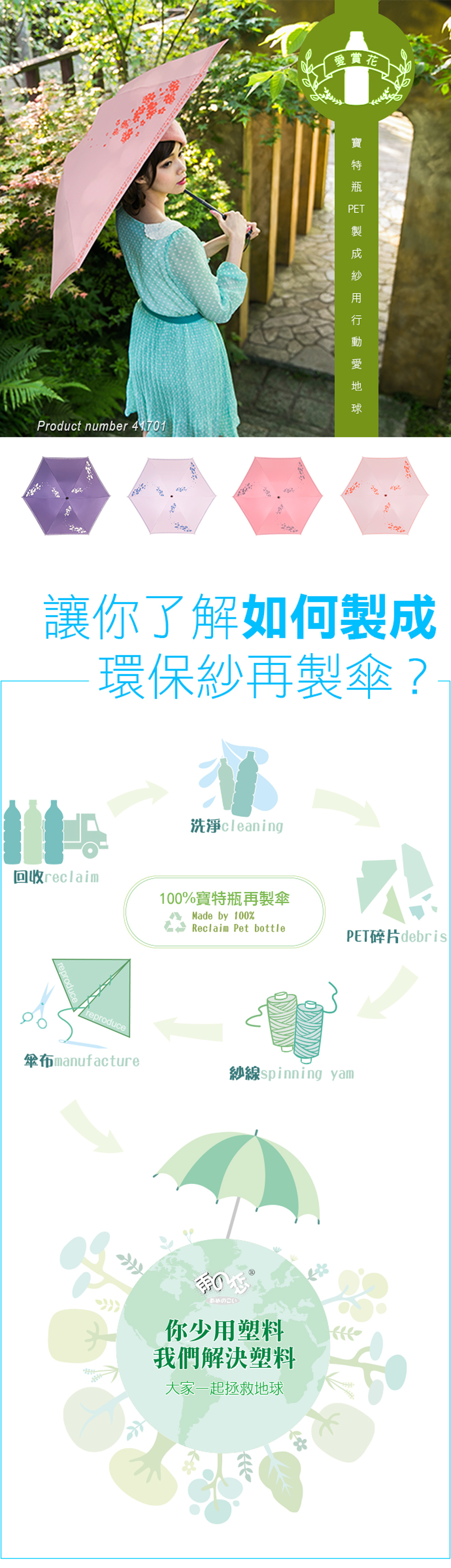 | 傘布材質 | 100%寶特瓶再製+台灣福懋10度鈦金膠 | 支骨/傘骨材質 | 抗強風強化塑鋼骨 | ||